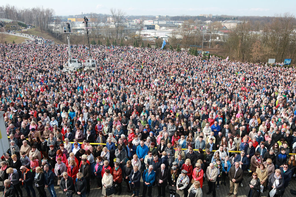 Kilkadziesiąt tysięcy wiernych zgromadziło się w łagiewnickim sanktuarium w Godzinie Miłosierdzia, której przewodniczył kustosz ks. Franciszek Ślusarczyk. Pielgrzymi modlili się m. in. za chrześcijan cierpiących i prześladowanych z powodu swojej wiary, a także za ojczyznę i państwa, w których toczą się konflikty zbrojne. Po nabożeństwie Mszę św. przy ołtarzu polowym odprawił krakowski biskup pomocniczy Damian Muskus OFM. W homilii wskazywał, że źródłem ludzkiej wolności jest prawda, „również trudna prawda o przeszłości, z którą trzeba się pojednać, za którą czasem trzeba przeprosić, która czasem oczekuje od nas przebaczenia”. „Aby ten proces pojednania i przebaczenia przyniósł owoce pokoju, musi odbywać się w przestrzeni miłosierdzia” – podkreślał.