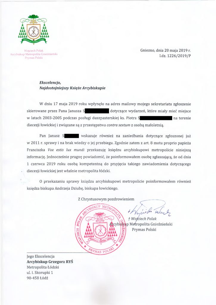 Dnia 20 maja 2019 roku otrzymałem od Księdza Prymasa Wojciecha Polaka pismo (L.dz. 1226/2019/P) następującej treści: