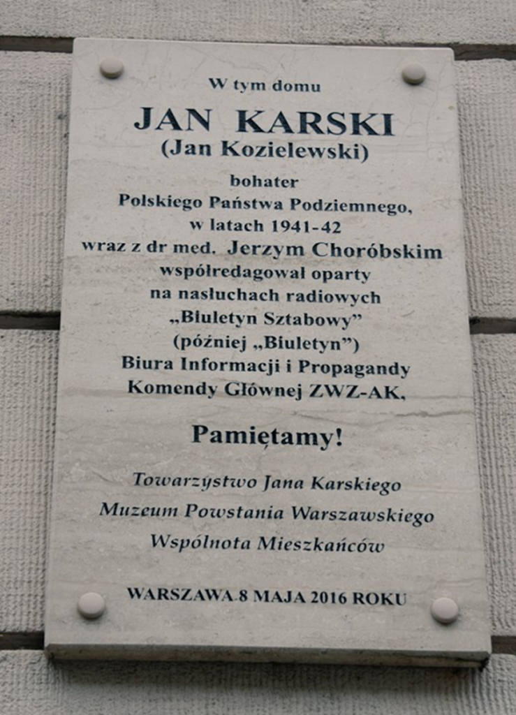 Przewodniczący Towarzystwa Jana Karskiego Waldemar Piasecki przypominał w odczytanym wystąpieniu symbolikę miejsca uroczystości: „Nie jest to jakieś miejsce wydumane i przyozdobione ‘elementem dekoracyjnym małej architektury’ jak języku urzędniczym nazywa się na przykład tzw. ławeczki Karskiego. Legendarny emisariusz w tym domu, w mieszkaniu docenta medycyny Jerzego Choróbskiego prowadził wraz z nim nasłuchy radiowe stacji brytyjskich i amerykańskich. W Muzeum Powstania Warszawskiego zachował się nawet radioodbiornik, który temu służył. Następnie sporządzał bieżący przegląd treści nasłuchu dla ścisłego kierownictwa politycznego i wojskowego Państwa Podziemnego. Miało to formę biuletynu dostarczanego do rąk własnych czterdziestu adresatów. Można powiedzieć bez wielkiej przesady, że Karski i Choróbski formowali w ten sposób poglądy kierowniczej elity Polski zmagającej się z okupacja hitlerowską, bowiem to oni decydowali, co jest warte umieszczenie w biuletynie.”