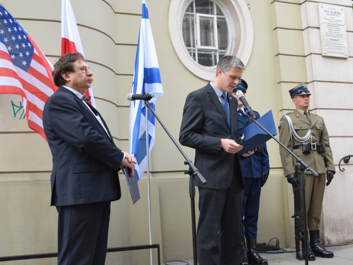 Po odegraniu hymnu, głos zabrał minister Jan Józef Kasprzyk. „Oddajemy dziś hołd bohaterowi Polski, Izraela, ale tak naprawdę bohaterowi ludzkości. Jan Karski, gdy deptana była godność człowieka, stanął odważnie po stronie wartości, które od wieków stanowiły fundament nie tylko starego kontynentu, ale fundament świata. Stanął po stronie dobra: rzymskiego poczucia prawa, greckiego poczucia piękna, chrześcijańskiej miłości bliźniego, judeochrześcijańskiego poszanowania drugiego człowieka. Jan Karski był człowiekiem niezwykłej odwagi. Ryzykując własne życie, starał się, poprzez swoją działalność ocalić życie setek tysięcy Żydów, prześladowanych przez narodowych niemieckich socjalistów – mówił.