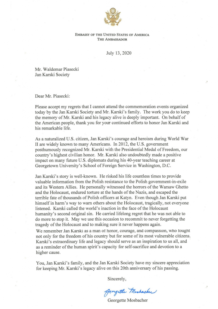 Reprezentujący panią ambasador Georgette Mosbacher, radca Yuri Fedkiw, odczytał jej list skierowany z okazji rocznicy do przewodniczącego Towarzystwa Jana Karskiego Waldemara Piaseckiego.
