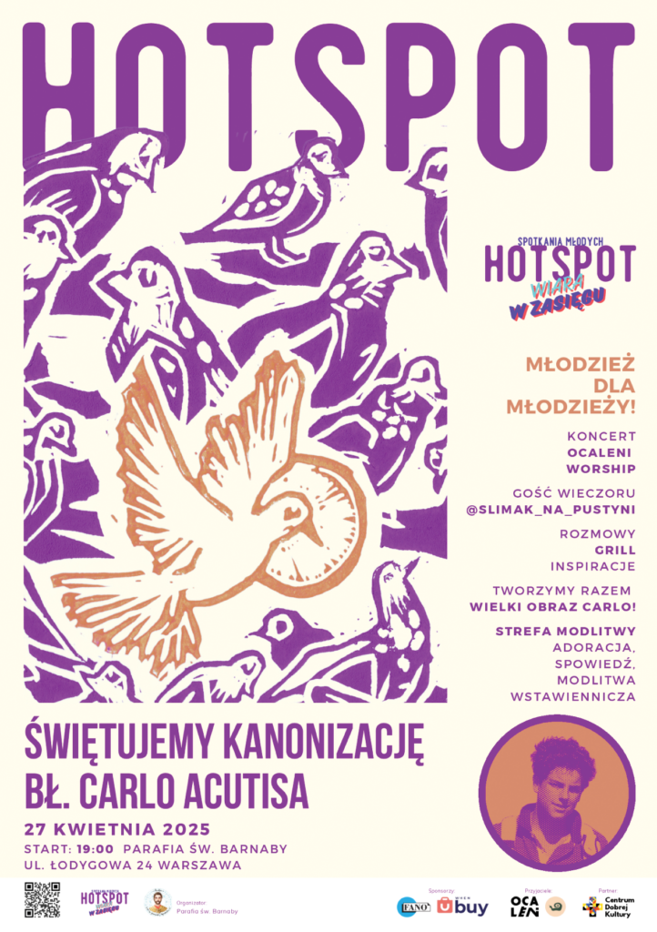 Już w niedzielę 27 kwietnia w parafii św. Barnaby Apostoła w Warszawie odbędzie się wyjątkowy wieczór dla młodych – HOTSPOT – Wiara w zasięgu. Wydarzenie jest odpowiedzią na jedno z najważniejszych wydarzeń w Kościele ostatnich lat – kanonizację bł. Carlo Acutisa, nastolatka, który pokazał światu, że świętość jest możliwa także dziś: w dżinsach, z plecakiem i smartfonem w dłoni.