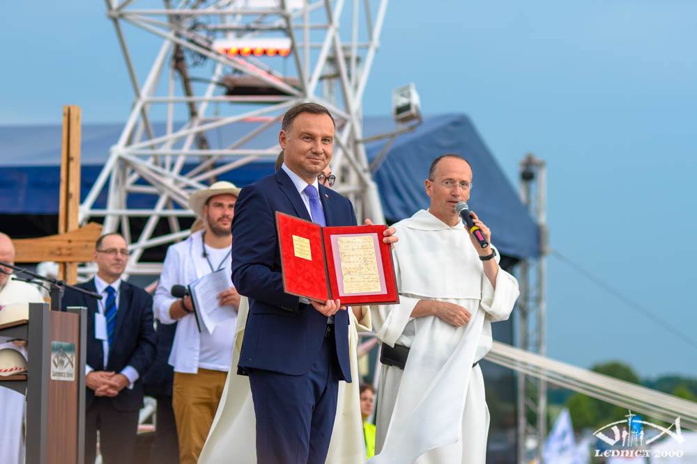 Andrzej Duda otrzymał z kolei symbolem tegorocznego spotkania na Polach Lednickich, którym jest zwierciadło. Wygrawerowany jest na nim wizerunek Pana Jezusa, dzięki czemu, jak mówią organizatorzy, można będzie spojrzeć w oczy Jezusa, ale też zobaczyć siebie w Bożych oczach. Prezydent wziął również udział we wspólnych tańcach z młodzieżą oraz włączył się we wspólny śpiew.