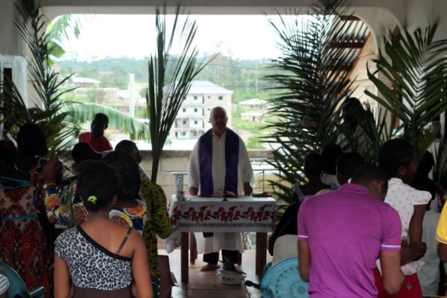 Już z samego rana dzieci polazły w pobliskie krzaki, aby narąbać gałęzi z palm. Aczkolwiek wyjście poza terytorium misji bez zgody jest zabroniony, ale dzisiaj niby można. Każdy skręca palmy na swój sposób. Powstają palmowe kwiatuszki, warkocze, kółka, kwadraty i jakieś zupełnie niezrozumiałe figury. Ktoś przytargał maleńką palmę z korzeniem i schował za beczką. Idziemy pod bramę wjazdową, tu się pomodlimy i wyruszymy procesją do naszej werando-kaplicy.