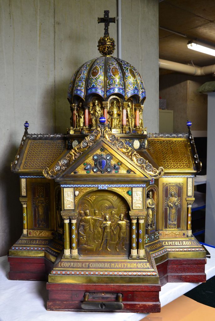 To bogato zdobione dzieło sztuki w kształcie bizantyjskiego kościoła ma 93 cm. wysokości; wykonali go w 1912 roku złotnicy z Akwizgranu. Relikwie św. Korony oraz innego męczennika, św. Leoparda sprowadził do katedry w Akwizgranie w 997 roku cesarz Otto III. W ramach prac wykopaliskowych w 1910 relikwie obojga świętych wydobyto z katakumb i później złożono w relikwiarzu. Przez 25 lat relikwiarz leżał w magazynie Muzeum Diecezjalnego.