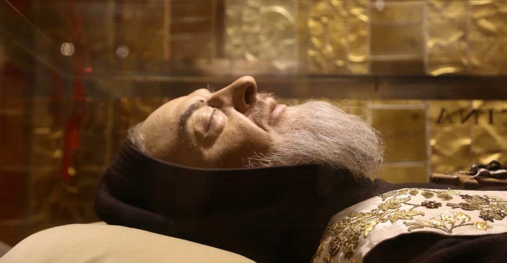 Ciało o. Pio w San Giovanni Rotondo; fot. Justyna GalantOjciec Pio to jeden z najpopularniejszych świętych XX wieku. Miał dar bilokacji, młodemu Karolowi Wojtyle przepowiedział papieską przyszłość, a ze stygmatów, które otrzymał w ciągu 50 lat wypłynęło 3,4 tys. litrów krwi. W 54. rocznicę śmierci włoskiego zakonnika Family News Service przypomina mniej znane fakty z jego życia.