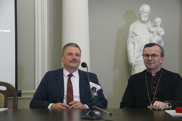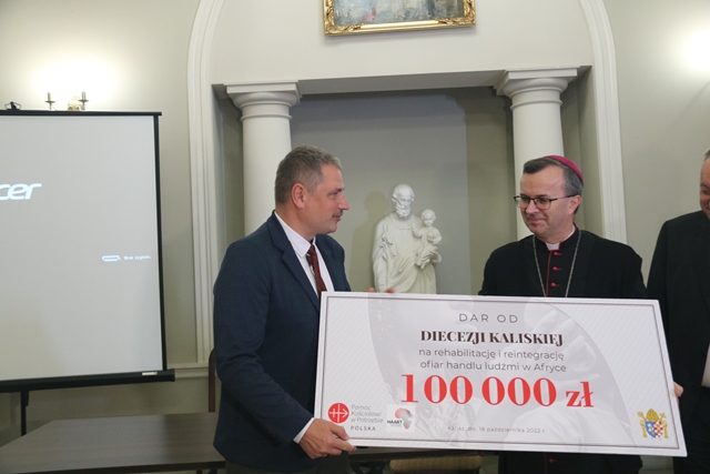 Fot. Ewa Kotowska-Rasiak/KAIDiecezja kaliska włączyła się w kampanię „WOLNI – nieWOLNI”: rehabilitacja i reintegracja ofiar handlu ludźmi w Afryce”. Na ten cel udało się zebrać 100 tys. zł. Biskup kaliski Damian Bryl przekazał symboliczny czek na ręce dra Radosława Malinowskiego z Fundacji HAART Kenya, która od 2010 r. ratuje, rehabilituje i reintegruje ofiary handlu ludźmi.