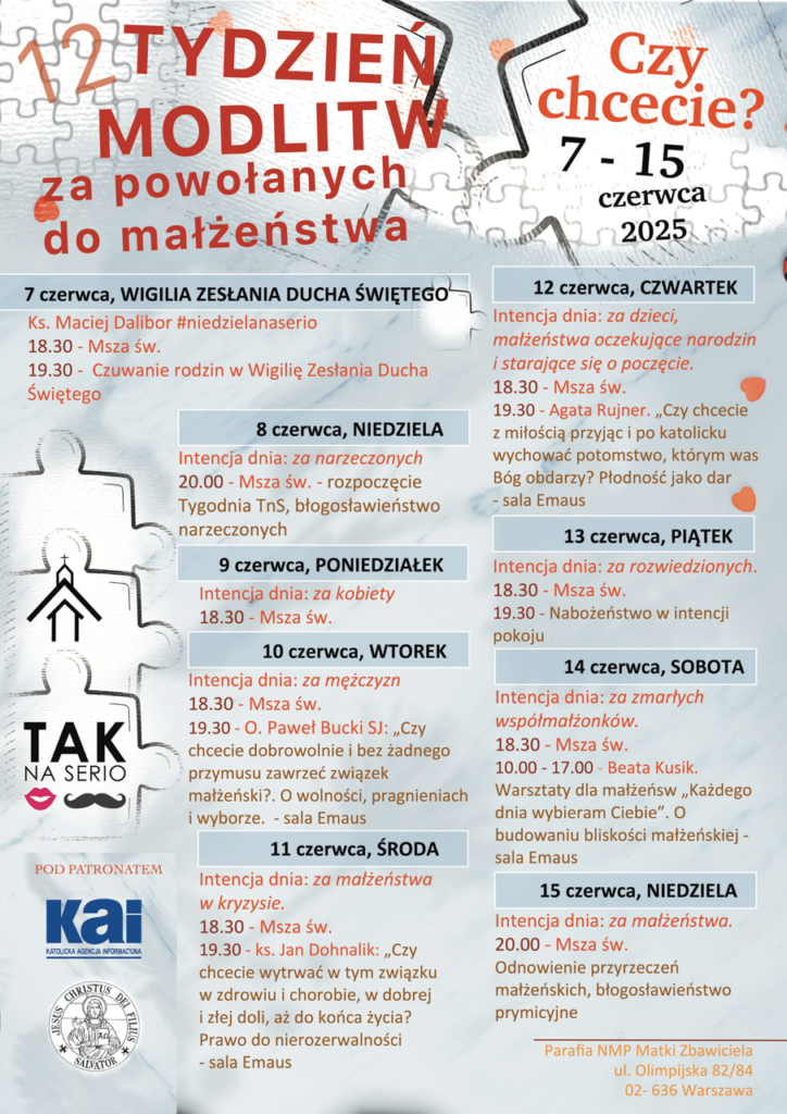 Codzienne intencje do modlitwy znajdują się na plakacie, będziemy je przypominać wieczorem podsumowując dzień i zapowiadając następny. Każdego dnia Tygodnia we wspomnianej parafii w Warszawie o godz. 18.30 sprawowana będzie Eucharystia w intencji dnia. Zapraszamy serdecznie na te Eucharystie, jeśli tylko jesteście w Warszawie.