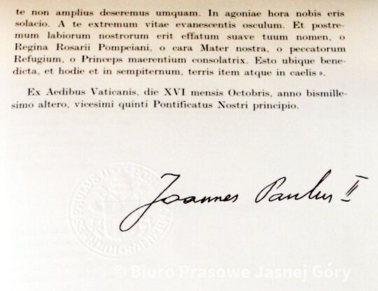 Fot. JasnaGoraNews / TwitterDokładnie dziś mija 20. rocznica ogłoszenia listu Jana Pawła II „Rosarium Virginis Mariae” (O różańcu). Na Jasną Górę papież ofiarował własnoręcznie podpisany tekst. Specjalny dar został tu przekazany 6 XI 2002r. podczas Jasnogórskiego Apelu. – To wyraz szczególnego umiłowania tego miejsca i nadziei Kościoła związanych z tym Sanktuarium – podkreślano. Różańcowe tajemnice światła odmawiane były w Kaplicy Matki Bożej o godz. 16.15.