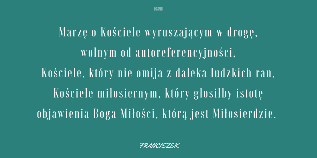 Marzę o Kościele wyruszającym w drogę, wolnym od autoreferencyjności, Kościele, który nie omija z daleka ludzkich ran, Kościele miłosiernym, który głosiłby istotę objawienia Boga Miłości, którą jest Miłosierdzie. Jest to to samo miłosierdzie, które czyni nas nowymi w miłości. A wiemy, jak bardzo rodziny chrześcijańskie są miejscem miłosierdzia i świadkami miłosierdzia. Po Jubileuszu Nadzwyczajnym będą nimi jeszcze bardziej, zaś spotkanie w Dublinie będzie mogło dać konkretne tego znaki.