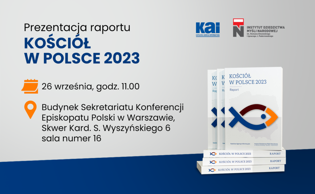 Katolicka Agencja Informacyjna wraz z Instytutem Dziedzictwa Myśli Narodowej zapraszają na prezentację Raportu „Kościół w Polsce 2023”. Dzieło to w syntetycznej formie prezentuje działalność Kościoła w Polsce zarówno w sferze duszpasterskiej, na polu ewangelizacji, jak i w dziedzinie charytatywnej i społecznej. Zawiera także aktualny obraz polskiej religijności wraz z przemianami jakich ona doświadcza, w szczególności w młodszym pokoleniu.