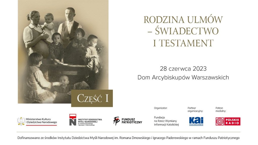 28 czerwca w sali konferencyjnej Domu Arcybiskupów Warszawskich odbędzie się konferencja zatytułowana „Rodzina Ulmów – świadectwo i testament”. Celem wydarzenia jest przypomnienie niezwykłych dziejów małżeństwa Józefa i Wiktorii, którzy podczas II wojny światowej zostali, wraz ze swoimi dziećmi, zamordowani przez hitlerowców za ukrywanie Żydów.