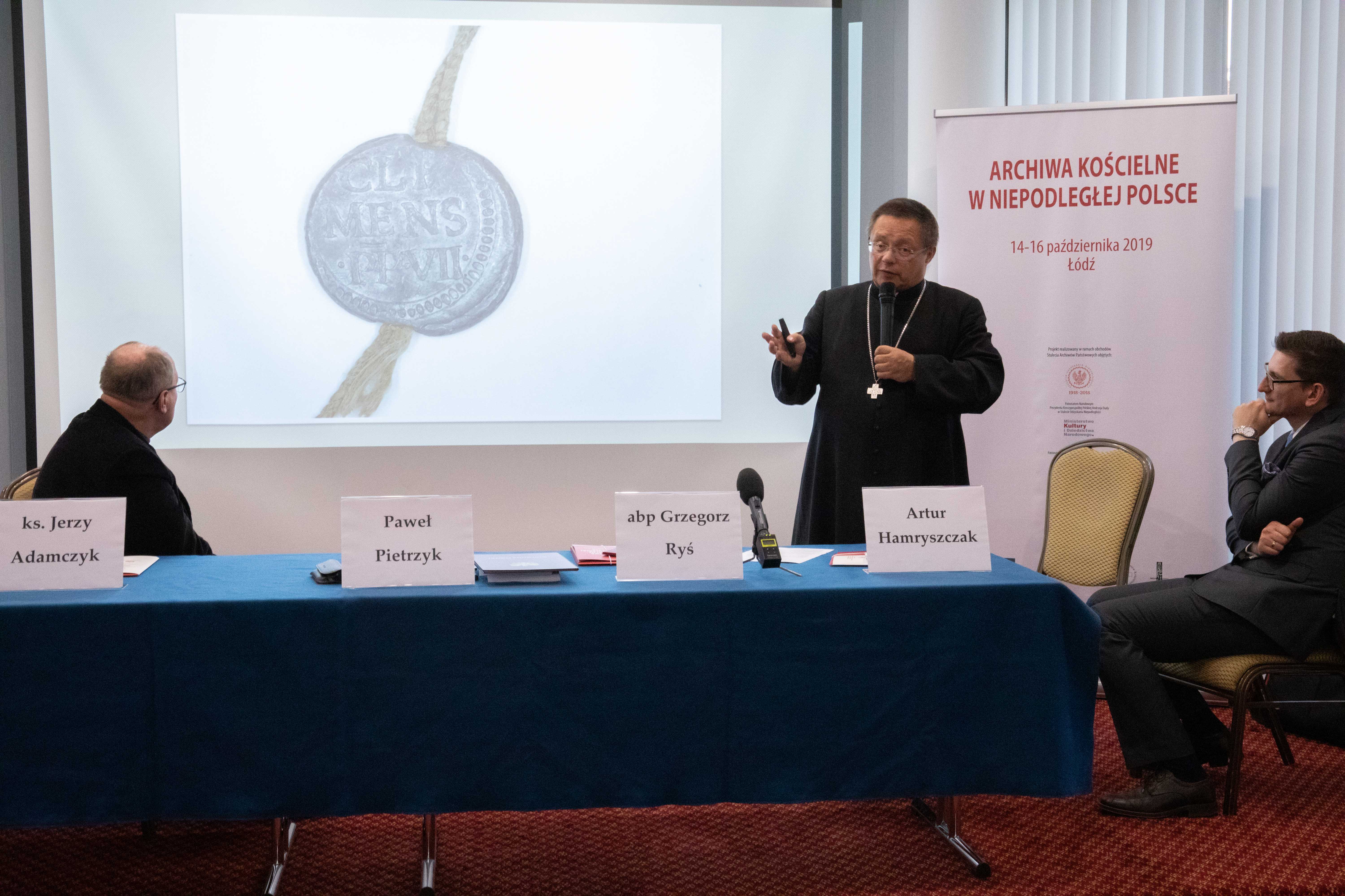 Arcybiskup łódzki zaprezentował przedłożenie zatytułowane „Ze skarbów archiwalnych prehistorii łódzkiego Kościoła”.