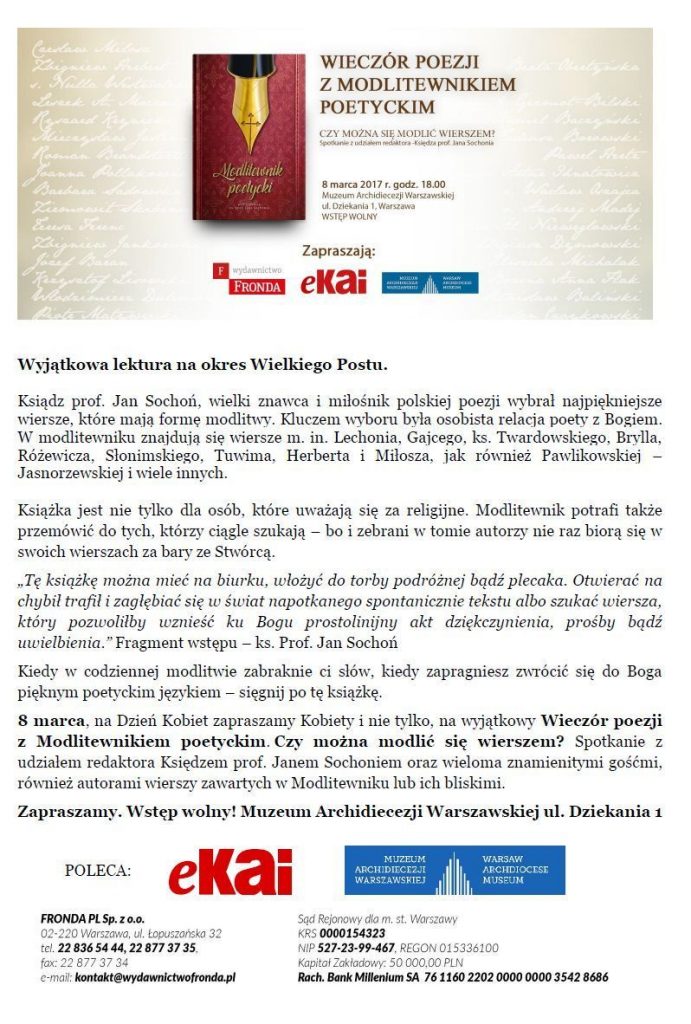 8 marca wieczór poezji z Modlitewnikiem Poetyckim