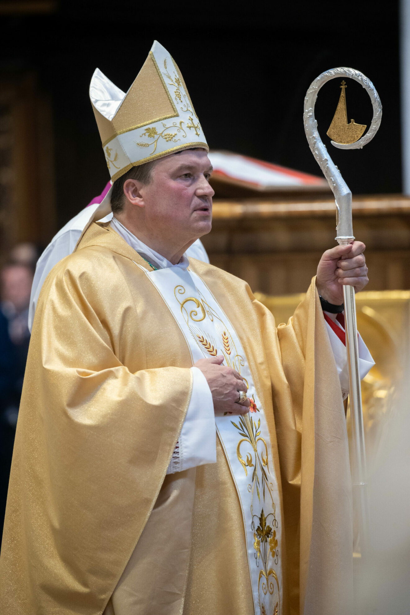 Kolejnym elementem święceń biskupich było namaszczenie głowy wybranego i przekazanie mu księgi Ewangelii oraz insygniów biskupich: pierścienia, mitry i pastorału.