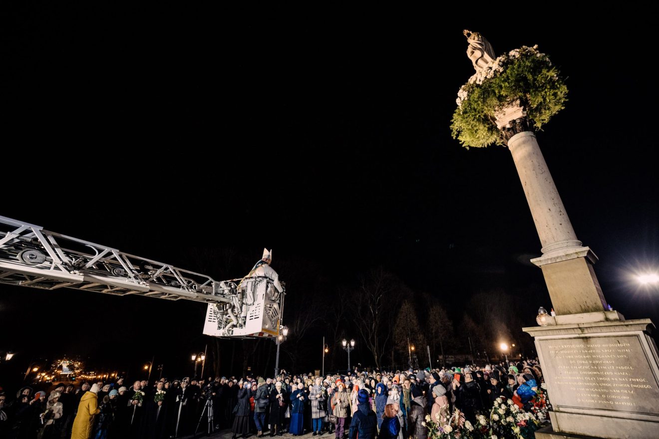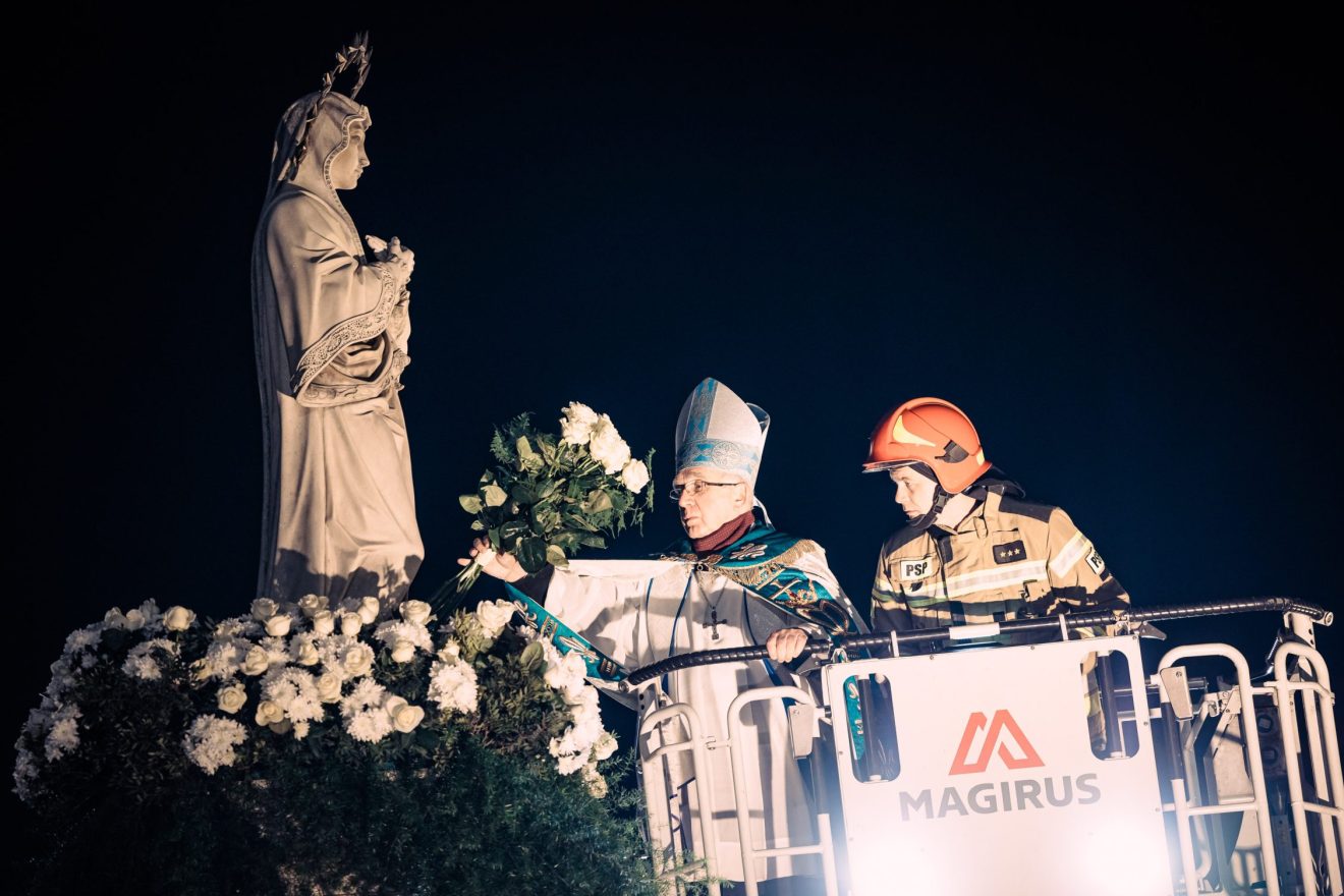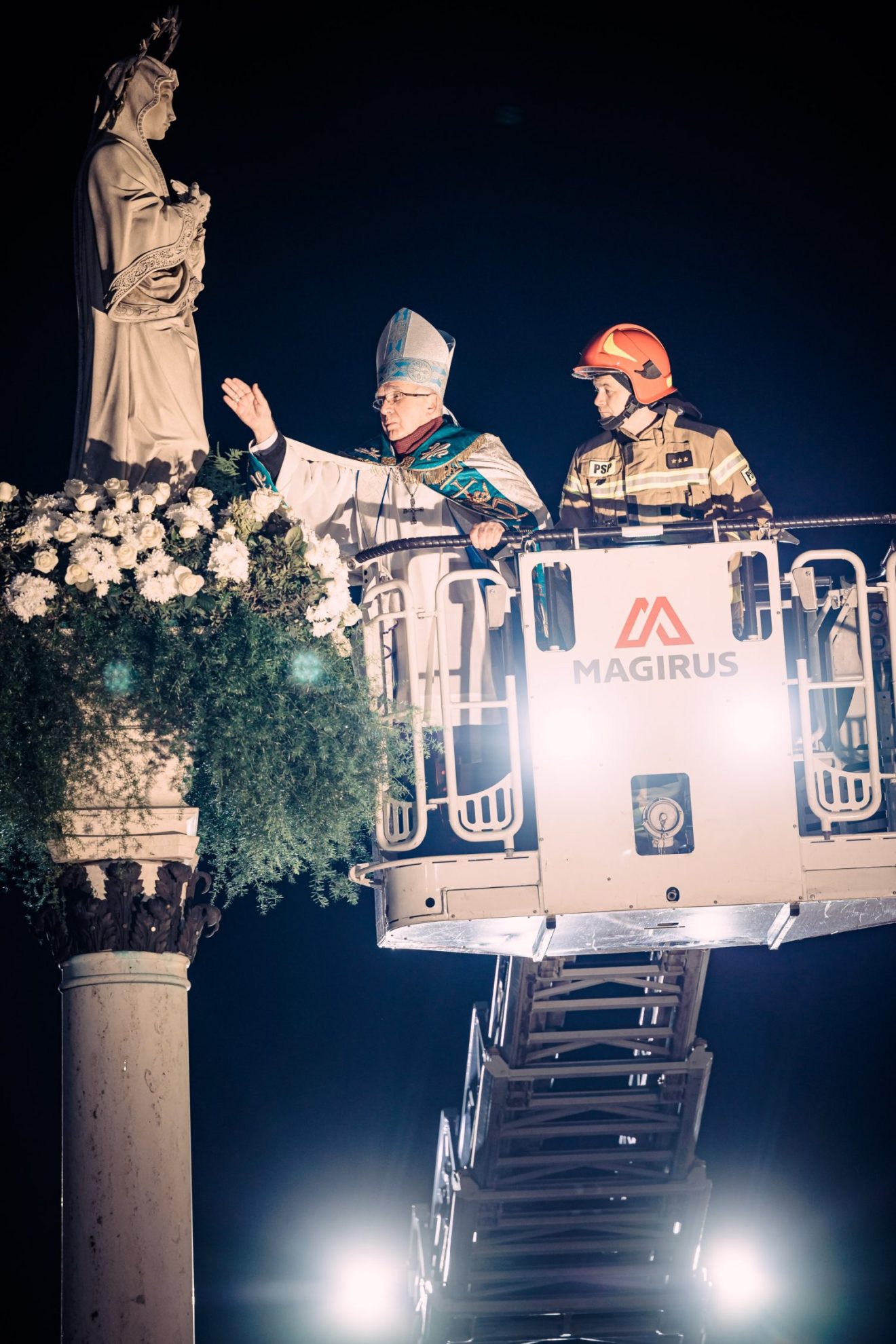 Po modlitwie główny celebrans na podnośniku wozu strażackiego przygotowanego przez Państwową Straż Pożarną w Częstochowie został uniesiony na wysokość figury, gdzie złożył wiązankę z białych kwiatów. Za przykładem arcybiskupa także wierni złożyli na cokole przed figurą przyniesione przez siebie kwiaty.