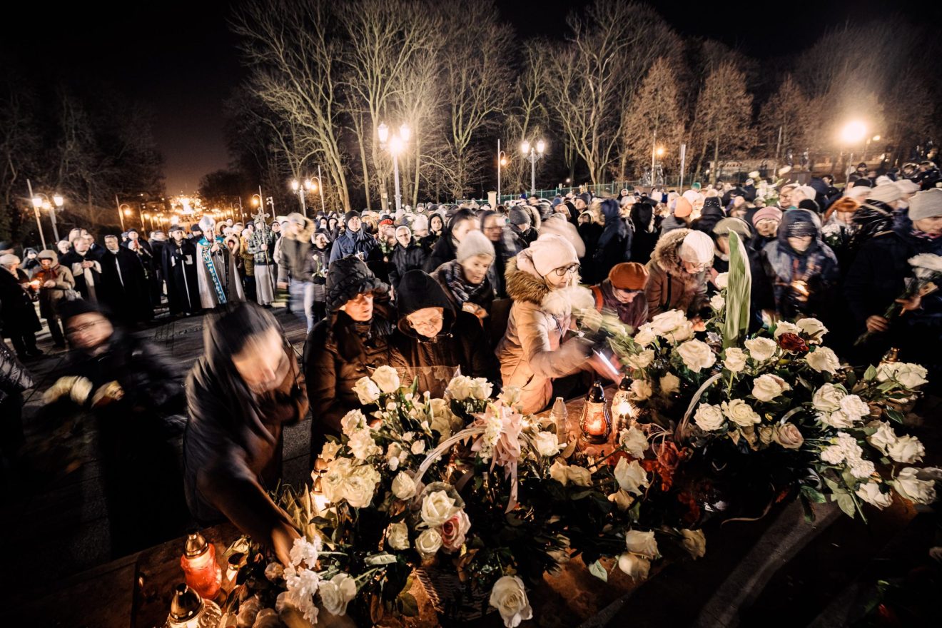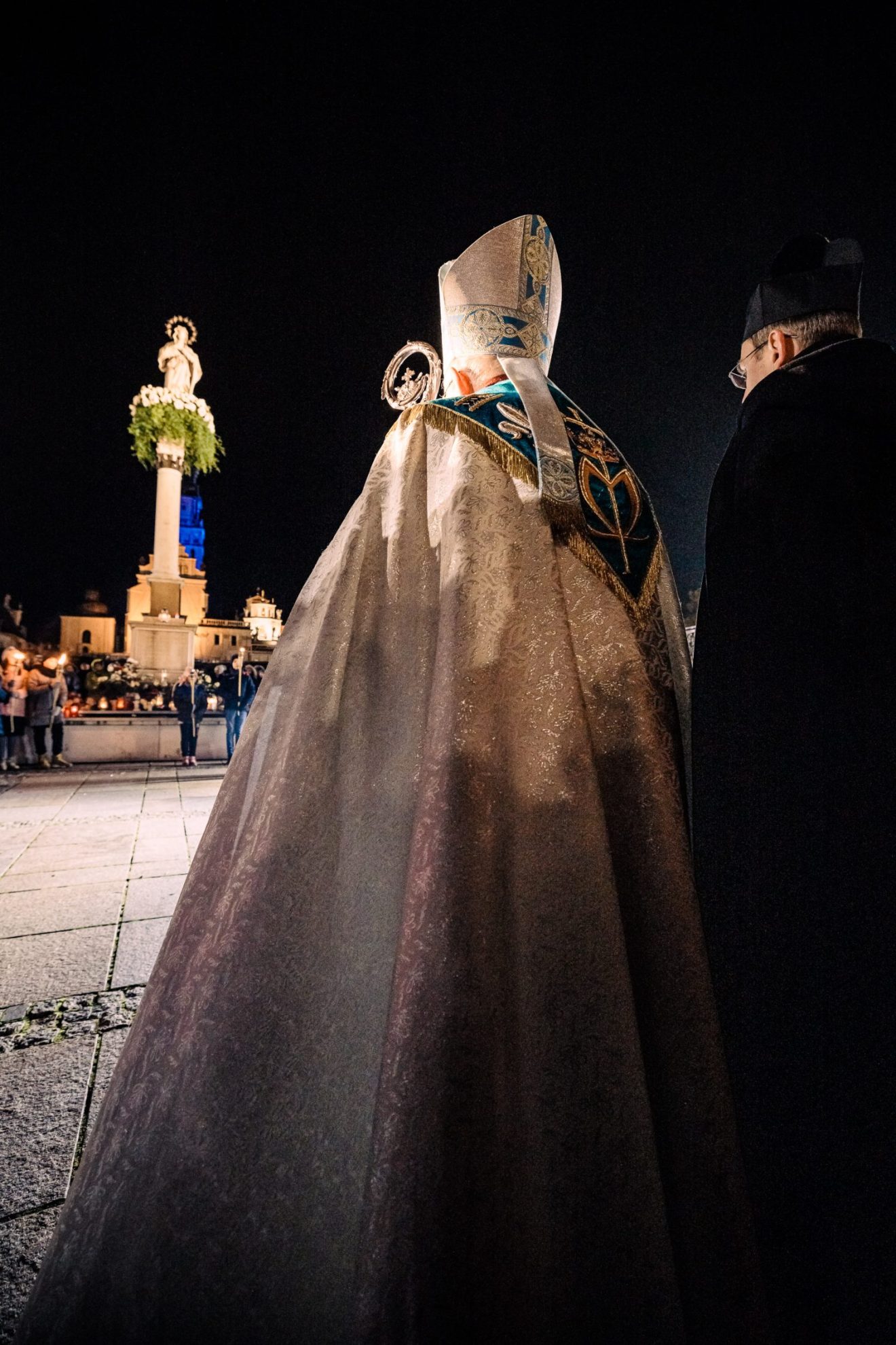 Fot. Piotr Tumidajski– Maryjo, gdy za naszą granicą toczy się brutalna wojna, pomóż nam ratować siebie i świat od wszelkiej przemocy – modlił się abp Wacław Depo, metropolita częstochowski, na Jasnej Górze podczas „Hołdu z kwiatów” w uroczystość Niepokalanego Poczęcia Najświętszej Maryi Panny. Wzięły w nim udział setki częstochowian i pielgrzymów. To zwyczaj praktykowany na Jasnej Górze od 2009 r., kiedy to poświęcona została nowa figura Niepokalanej na placu przed Szczytem.