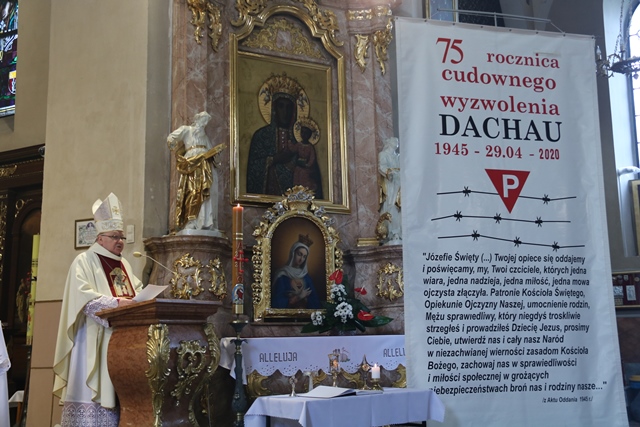 Przypomniał, że 22 kwietnia 1945 r. kapłani przebywający w obozie koncentracyjnym w Dachau oddali się w opiekę św. Józefowi. – Inicjatywa aktu zawierzenia wyszła od ks. Jana Adamieckiego z Włocławka, a ostateczną wersję przygotował zespół z ks. kanonikiem Franciszkiem Jedwabskim z Poznania i ks. kanonikiem Bolesławem Kunką z Włocławka. Na wstawiennictwo św. Józefa nie trzeba było długo czekać, bo 29 kwietnia 1945 r. żołnierze z patrolu VII Armii Amerykańskiej wyzwolili obóz na kilka godzin przed planowaną przez hitlerowców jego całkowitą likwidacją i wymordowaniem pozostających w nim więźniów – akcentował metropolita wrocławski senior.