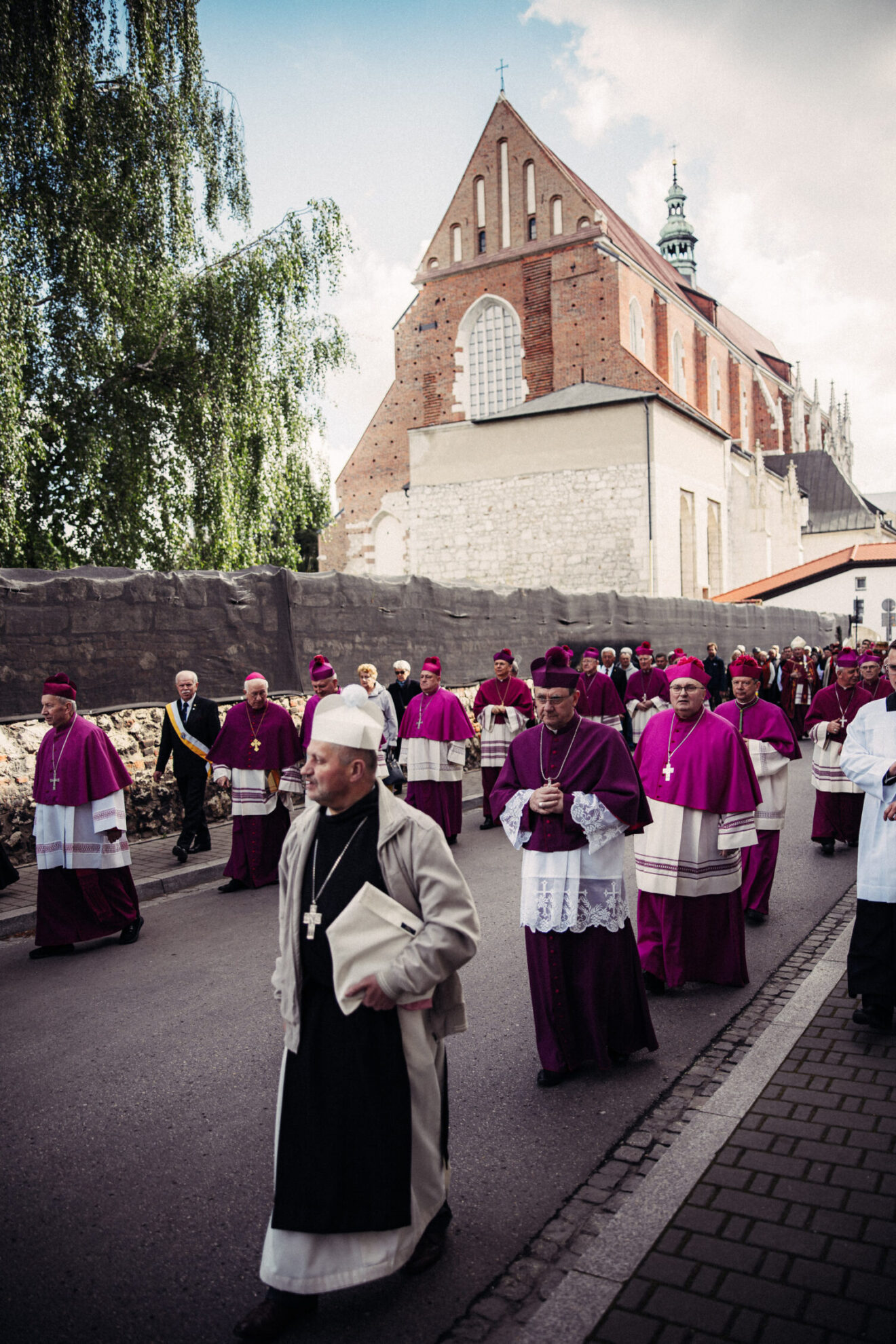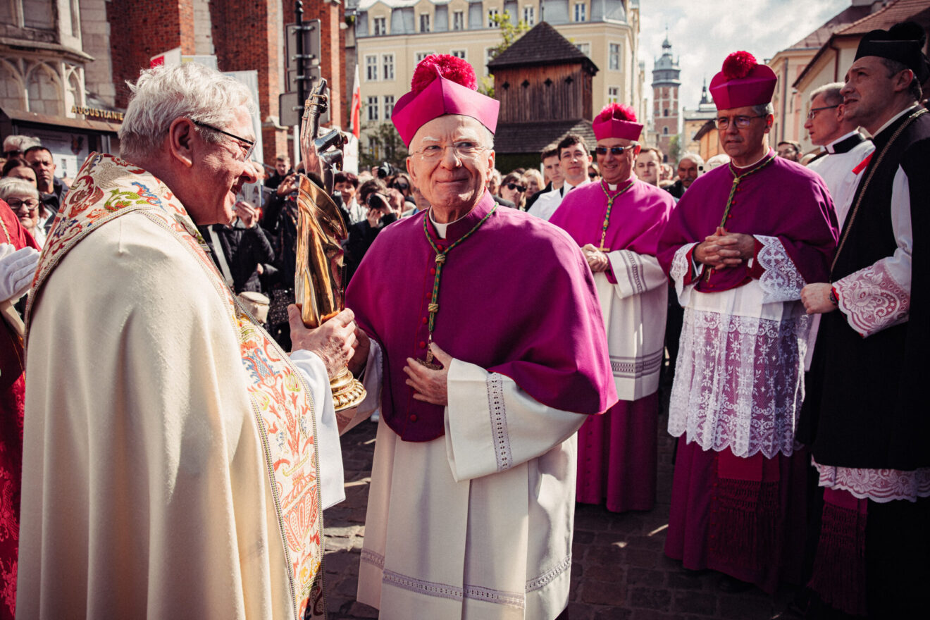 Na początku Mszy św. metropolita krakowski, abp Marek Jędraszewski przywołał fragment pierwszego po wyborze przemówienia papieża Leona XIV i powiedział, że w tych słowach należy odczytać echo wypowiedzi Jezusa, który tuż przed męką mówił do Apostołów: „Pokój zostawiam wam, pokój mój daję wam”. W dalszej części wypowiedzi nawiązał do hymnu „Gaude Mater Polonia”. – Cieszymy się bardzo, ponieważ w uroczystość św. Stanisława kardynałowie wybrali nowego następcę św. Piotra. W ten sposób dokonało się to, co w posłowiu drugiej części „Tryptyku Rzymskiego” zapowiadał św. Jan Paweł II, zarówno w odniesieniu do swego bezpośredniego następcy, jak i do kolejnych papieży: „I tu właśnie u stóp tej przedziwnej sykstyńskiej polichromii zbierają się kardynałowie – wspólnota odpowiedzialna za dziedzictwo kluczy Królestwa” – cytował arcybiskup. Podkreślił, że obecność podsekretarza Dykasterii Nauki Wiary, abp. Philippe Curbelié, pozwala przeżywać szczególną więź z papieżem Leonem XIV. – Wasza Ekscelencjo, bardzo cieszymy się z obecności Księdza Arcybiskupa pośród nas i prosimy o sprawowanie Mszy św. w intencji Ojca Świętego, jak również w intencji Krakowa, Archidiecezji Krakowskiej oraz całej naszej Ojczyzny Polski, a także w intencji pokoju na świecie, zwłaszcza w Ziemi Świętej i na Ukrainie – zwrócił się do celebransa abp Marek Jędraszewski.