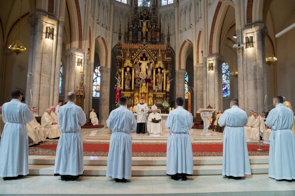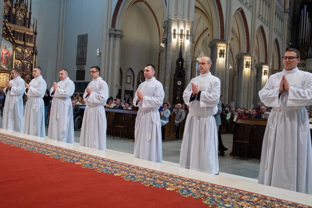 W sobotę przed południem w bazylice archikatedralnej siedmiu alumnów V roku Wyższego Seminarium Duchownego w Łodzi, przyjęło z rąk abp. Grzegorza Rysia święcenia diakonatu.