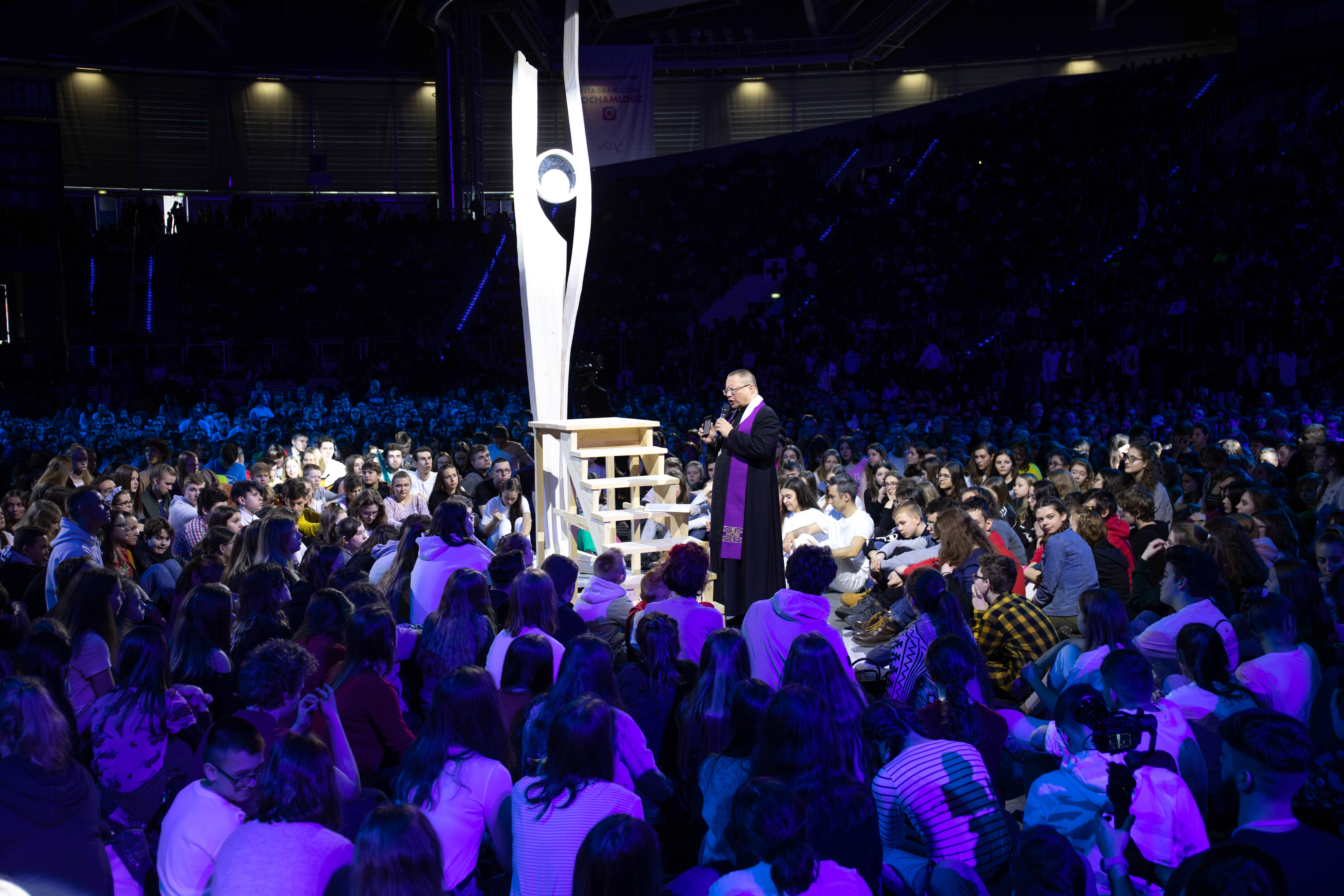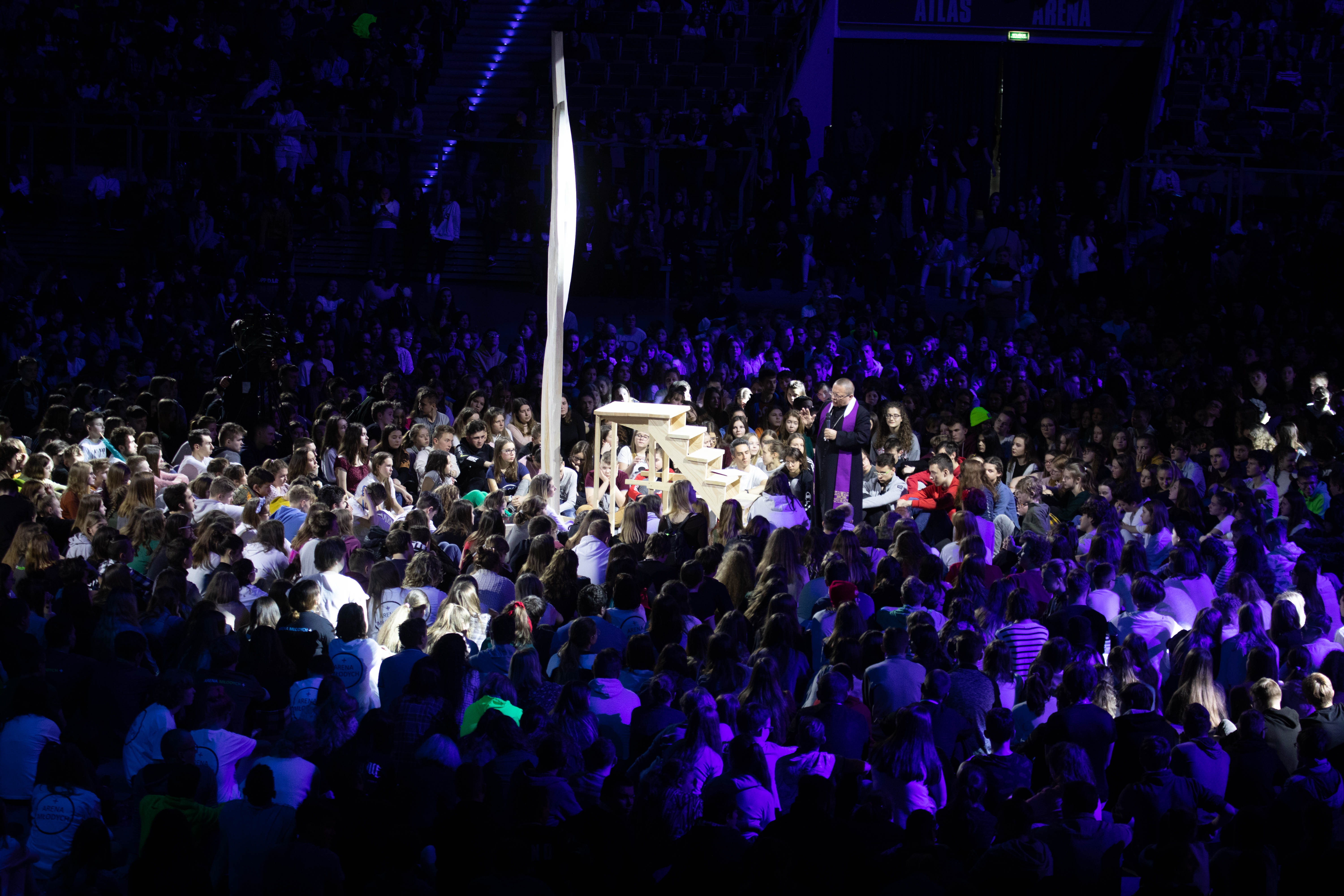 Po teatralnej inscenizacji został wprowadzony Najświętszy Sakrament i umieszczony w samym sercu Areny. Zgromadzona dookoła młodzież w obecności Chrystusa Eucharystycznego wysłuchała katechezy metropolity łódzkiego, który przywołując raz jeszcze fragment ewangelii wskazał, że „imię dla autora Biblii to jest to, co ciebie najbardziej określa. Imię mówi: kim jesteś? Jak masz na imię? – pytał Jezus opętanego. Ten odpowiedział – Legion. Legion to było 6.826 żołnierzy – tyle liczył legion rzymski. To znaczy, że ten człowiek powiedział do Jezusa – tak mam na imię – to jest moja rzeczywistość. Mam w sobie 6826 demonów – czyli w zaokrągleniu mam w sobie 7 tyś. diabłów. Myślę, że to nie jest proste – powiedzieć coś takiego. To jest pierwszy moment wolności, że możesz do Jezusa powiedzieć: jest mi to, i to, i to, i to. Wiecie, dlaczego jest to pierwszy moment do wolności? Bo jak my wdepniemy w grzech, a zwłaszcza, gdy wdepniemy w grzech głęboko – tak jak on, to pierwszą radą demona jest – tylko nikomu nie mów!” – podkreślił arcybiskup. – Jak chcecie takiej przemiany, jaka dokonała się u człowieka z ewangelii, to musicie odpowiedzieć Jezusowi na pytanie: jak ci na imię, tzn. co jest tym, co cię trzyma? Co jest tym, co cię zniewala? Co jest tym, co cię zabija? Co jest tym, co ci odebrało twoją tożsamość? Powiedz, jakie jest twoje imię? Jak powiesz, to zacznie się proces wyzwolenia – podkreślił abp Ryś.