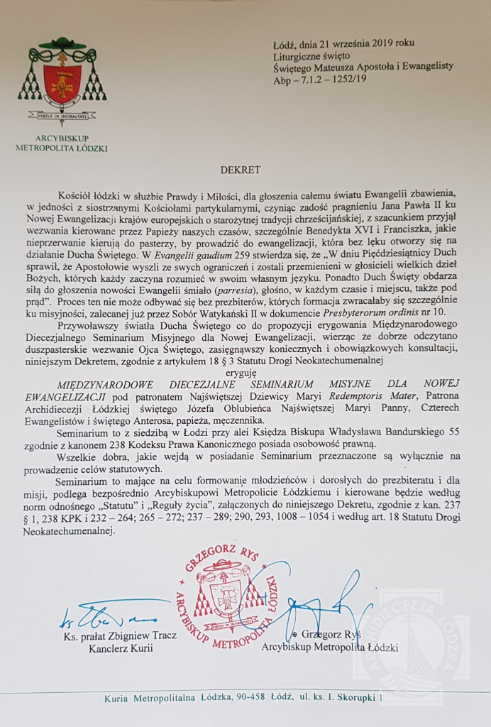 Fot. ks. Paweł Kłys21 września arcybiskup Grzegorz Ryś podpisał dekret powołujący nowe seminarium duchowne w Łodzi – Międzynarodowe Diecezjalne Seminarium Misyjne dla nowej Ewangelizacji Redemptoris Mater.
