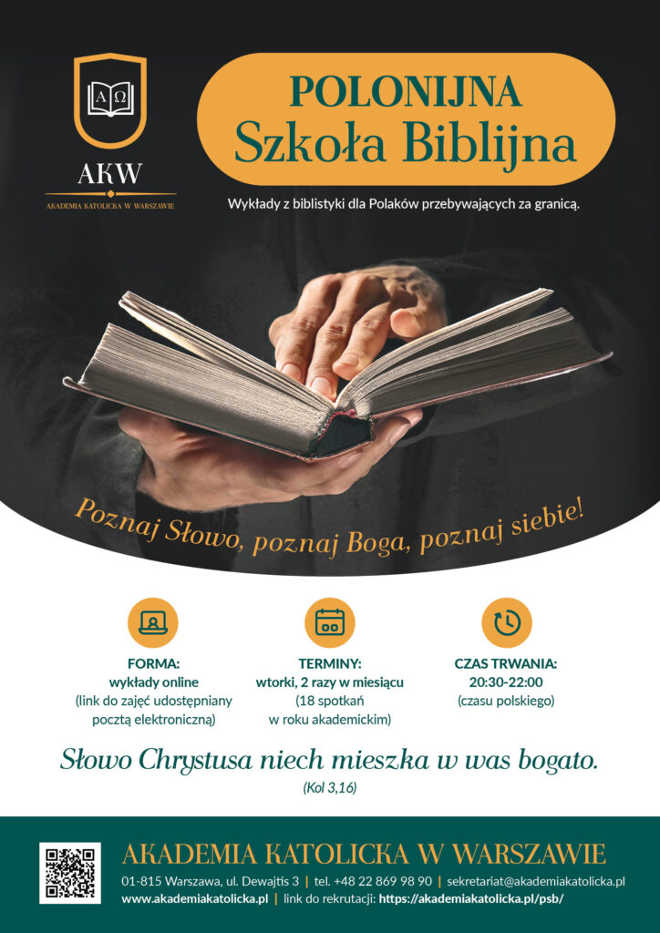 Akademia Katolicka w Warszawie uruchamia Polonijną Szkołę Biblijną – nową inicjatywę edukacyjną skierowaną do Polaków mieszkających poza granicami kraju. Program obejmuje dwuletni cykl wykładów online, które mają wprowadzić uczestników w świat ksiąg Starego i Nowego Testamentu.