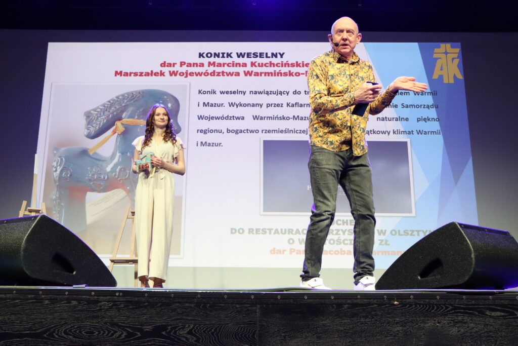 Zanim jednak rozpoczęły się licytacje przekazanych darów, na scenie wystąpiły dzieci z domu dziecka w Szymonowie. Przedstawiły adaptację baśni „Dziewczynka z zapałkami”. Publiczność usłyszała także piosenkę o ich placówce. Po chwili na scenę wkroczył prowadzący – aktor Paweł Burczyk, który jak zawsze z ogromnym humorem i pełną energią, zachęcał do podbijania stawek, a rywalizacja między darczyńcami przebiegała w przyjaznej atmosferze. – Jestem z wentą od samego początku. Prowadzę ją od prawie 28 lat. Prawie, bo nie było mnie tylko na dwóch. To jest naturalne, że ja tu jestem. Ja mam taką potrzebę tu być – podkreśla Paweł Burczyk. Wśród darów, które poszły pod młotek, był m.in. autograf astronauty dr Sławosza Uznańskiego-Wiśniewskiego, zaproszenie od prezydenta Olsztyna, Roberta Szewczyka do loży prezydenckiej na wspólne oglądanie meczu Indykpolu AZS Olsztyn, czy chociażby cukiernica przekazana przez senatora Gustawa Marka Brzezina. Wisienką na torcie było pióro od Pierwszej Damy, Marty Nawrockiej. Do tego kolacja w sejmowej restauracji, obrazy, broszki, vouchery i zaproszenia. – Jestem tu bo chcę pomóc tym dzieciom. Wylicytowałem obraz. Rodzice mojej żony to podopieczni tej placówki, więc mam też taki sentyment do tego domu dziecka – mówi Marcin Maksymiuk, mieszkaniec Olsztyna.
