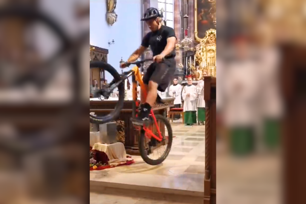 Akrobacje górskiego rowerzysty za ołtarzem. Proboszcz chciał podkreślić treść kazania [WIDEO]