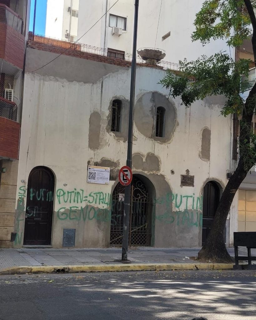 Ambasada Federacji Rosyjskiej domaga się od władz Argentyny ukarania sprawców, gdyż napisy, które wykonano zielonym sprayem w nocy z 1 na 2 kwietnia, „znieważają Rosję i jej kierownictwo”.