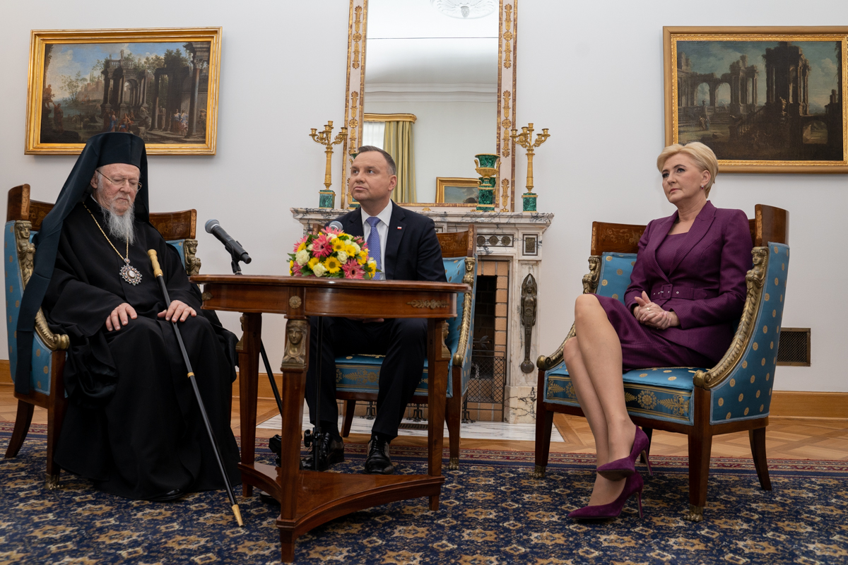 Andrzej Duda podkreślił na wstępie, że wspólnie z małżonką ogromnie cieszy się ze spotkania z Bartłomiejem I. – Jesteśmy także zaszczyceni wraz ze wszystkimi ludźmi wierzącymi w Polsce, że możemy przywitać na naszej ziemi patriarchę Konstantynopola Jego Świątobliwość Bartłomieja. To jest dla nas wielka radość i wielki zaszczyt, że ponownie Jego Świątobliwość jest tu na naszej ziemi, zwłaszcza w tak trudnym czasie.