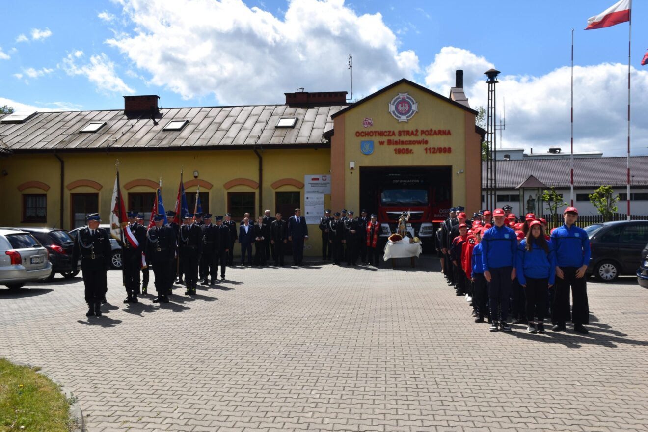 Relikwie zostały powitane przez ks. Henryka Wójcika i Gminnego Kapelana Strażaków ks. Waldemara Gulę. W imieniu strażaków powitanie wygłosił druh Zdzisław Prusek, prezes OSP Miedzna Drewniana. – Św. Florianie, przybywasz do nas z królewskiego Krakowa, w dniu swojego i naszego święta, aby zapewnić nam i naszym rodzinom opiekę – mówił druh Prusek.
