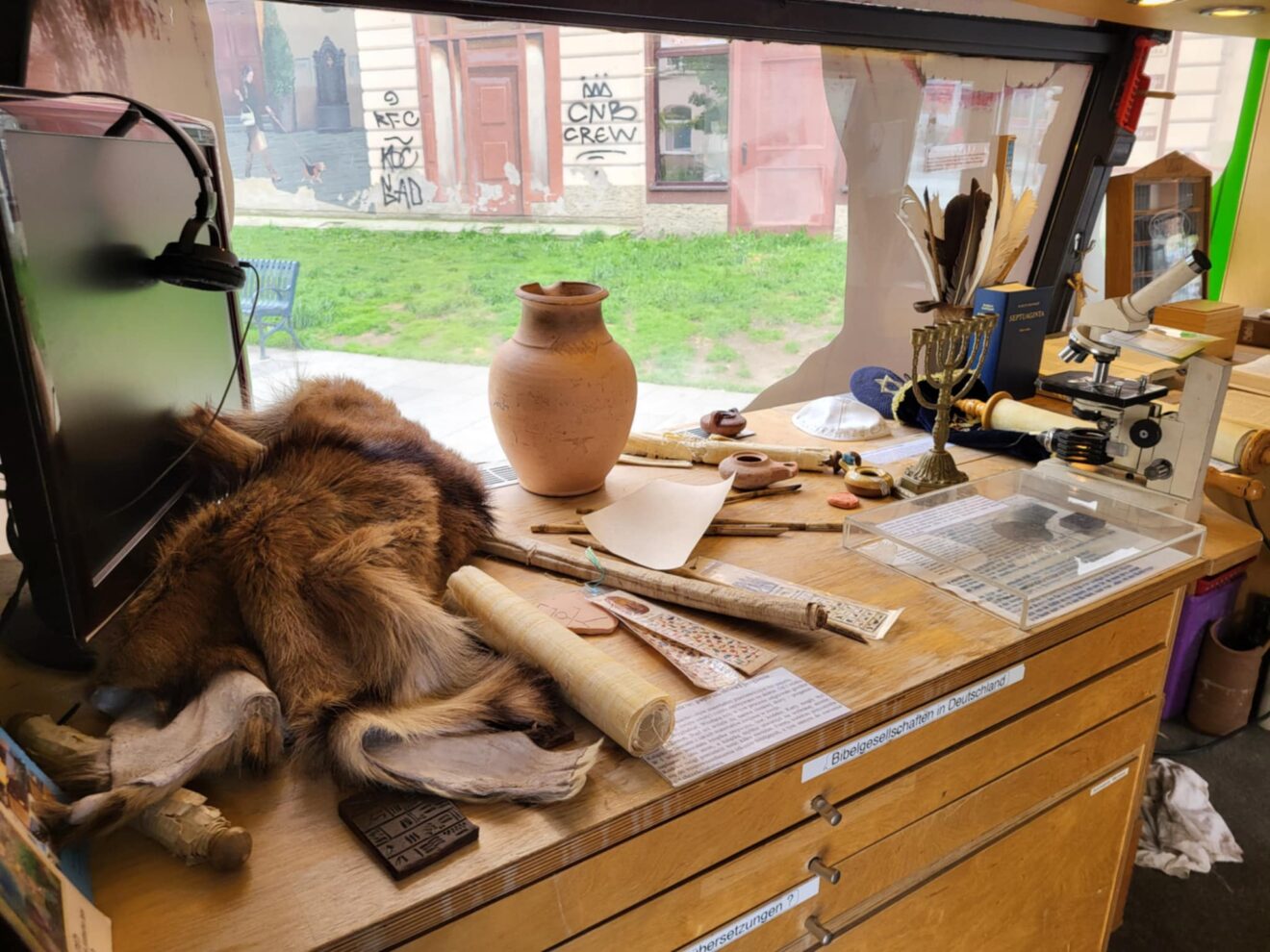 – Bibliobus to mobilna wystawa Biblii, historii piśmiennictwa oraz druku – tłumaczy Iga Zalisz. – W Bibliobusie można zobaczyć wystawę od samych początków piśmiennictwa poprzez to jak tłumaczono kolejne przekłady Biblii. Można obejrzeć współczesne przekłady Biblii oraz zobaczyć najmniejszą Biblię świata, którą można czytać tylko pod mikroskopem. – dodaje dyrektor generalny Towarzystwa Biblijnego w Polsce.
