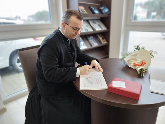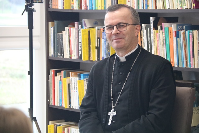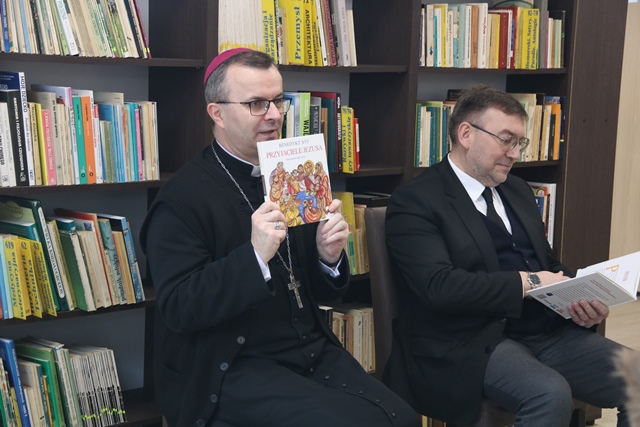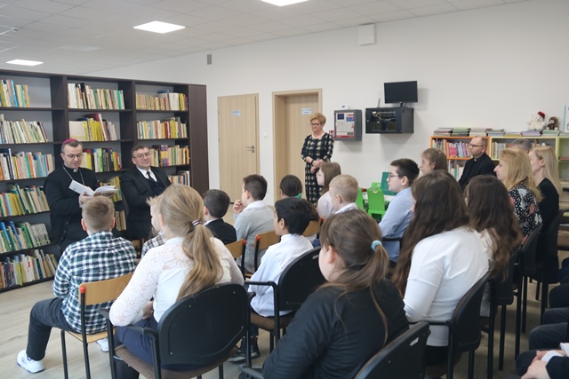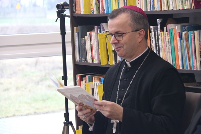 Fot. Ewa Kotowska-Rasiak/Diecezja KaliskaBiskup kaliski Damian Bryl przeczytał dzieciom fragmenty książki „Przyjaciele Jezusa” autorstwa Benedykta XVI. Spotkanie odbyło się w bibliotece w Strzyżewie.