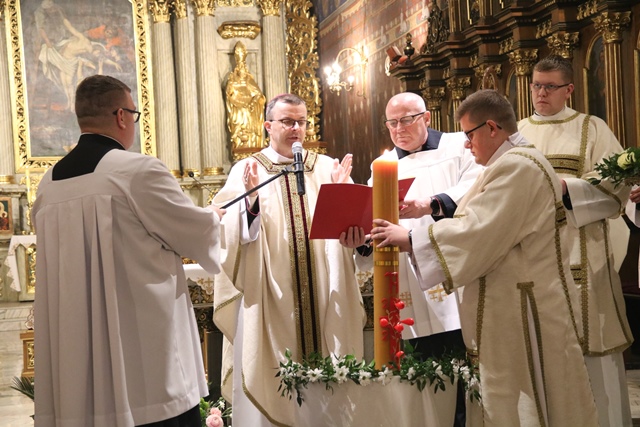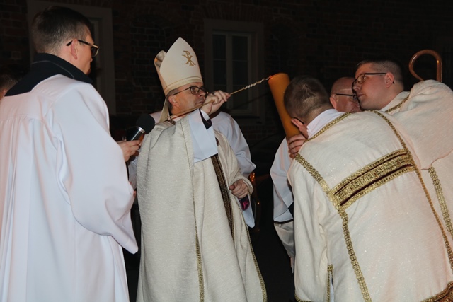 Biskupom, kapłanom i wiernym życzenia złożył ks. prał. Adam Modliński. – W tę świętą noc, pełni paschalnej radości, stajemy przed Panem Jezusem Chrystusem, który przez mękę, krzyż i chwalebne zmartwychwstanie otworzył nam bramę nieba i obdarzył nowym życiem. Życzę, aby doświadczenie bliskości zmartwychwstałego Pan umacniało naszą wiarę, rozpalało miłość i ożywiało nadzieję, abyśmy mieli odwagę światło Chrystusa zmartwychwstałego zanieść tam, gdzie panują mroki grzechu, zwątpienia i niepewności jutra – życzył proboszcz katedry.
