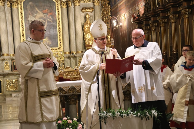 Fot. Ewa Kotowska-Rasiak/KAIChrystus powstał z martwych dzięki chwale Ojca. To nie jest coś obok nas, to jest rzeczywistość, w którą zostaliśmy włączeni – mówił biskup kaliski Damian Bryl w katedrze kaliskiej podczas Liturgii Wigilii Paschalnej.b