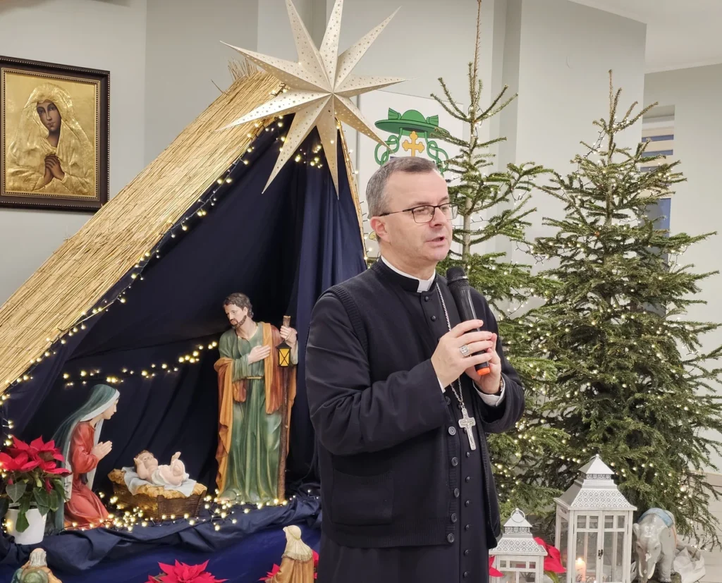 Fot. Ewa Kotowska-Rasiak/KAI– Bliskość Pana Boga łączy nas, otwiera nasze serca na tych, którzy są obok nas. My ludzie wierzący jesteśmy tymi, którzy szukają wspólnoty, szukają relacji, bliskości. Nie szukamy tego co dzieli, ale tego, co łączy – mówił bp Damian Bryl do przedstawicieli Akcji Katolickiej z całej diecezji kaliskiej podczas Mszy św. w kaplicy Wyższego Seminarium Duchownego w Kaliszu. Po Eucharystii biskup kaliski złożył życzenia i przełamał się opłatkiem.