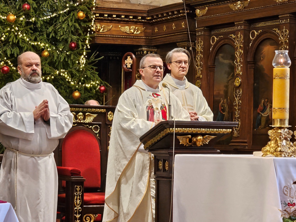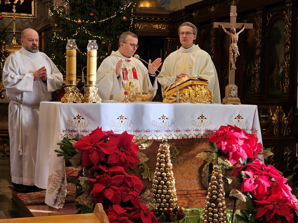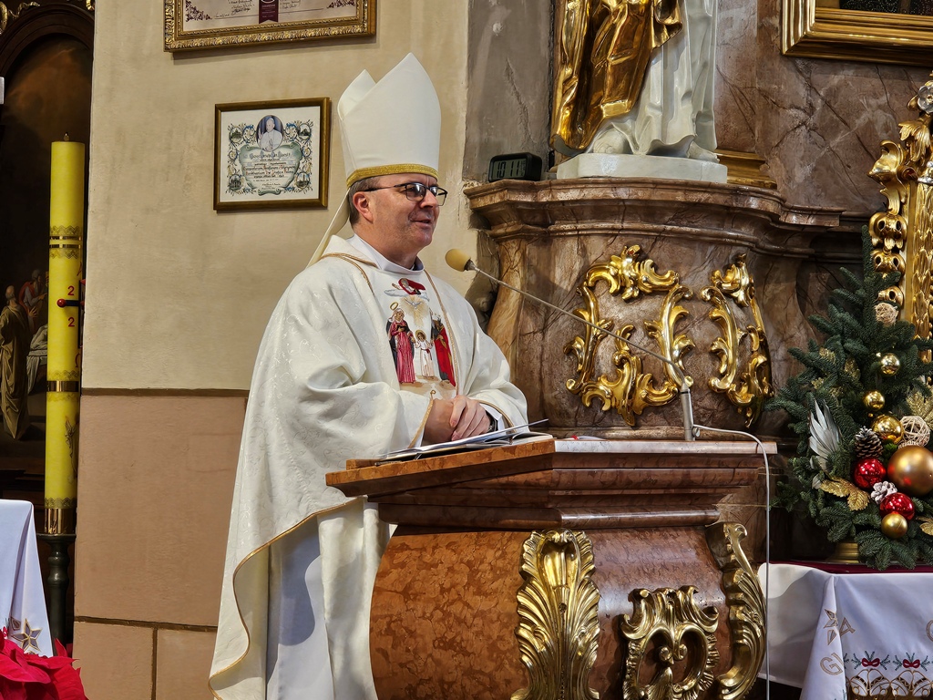 Po Mszy św. bp Damian Bryl spotkał się z katechetami w Domu Pielgrzyma im. św. Józefa na łamaniu się opłatkiem i wspólnym kolędowaniu.