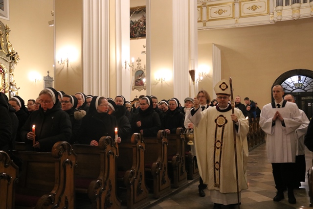 Fot. Ewa Kotowska-Rasiak/KAI– Współczesne społeczeństwo bardzo potrzebuje waszej pracy, waszego oddania, waszych dzieł, ale nade wszystko potrzebuje waszego świadectwa, waszego życia oddanego Bogu – mówił biskup kaliski Damian Bryl do osób konsekrowanych w katedrze św. Mikołaja w Kaliszu, gdzie przewodniczył Mszy św. w Światowym Dniu Życia Konsekrowanego.