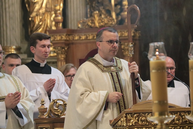 Fot. Ewa Kotowska-Rasiak/KAI– Chciałbym, abyśmy modlili się o to, żeby w tych bardzo wielu zaangażowaniach nie stracić zasadniczego kierunku, że jesteśmy sługami zbawienia – mówił biskup kaliski Damian Bryl, który przewodniczył w katedrze św. Mikołaja w Kaliszu Mszy św. Krzyżma. Podczas Eucharystii odnowiono przyrzeczenia kapłańskie.