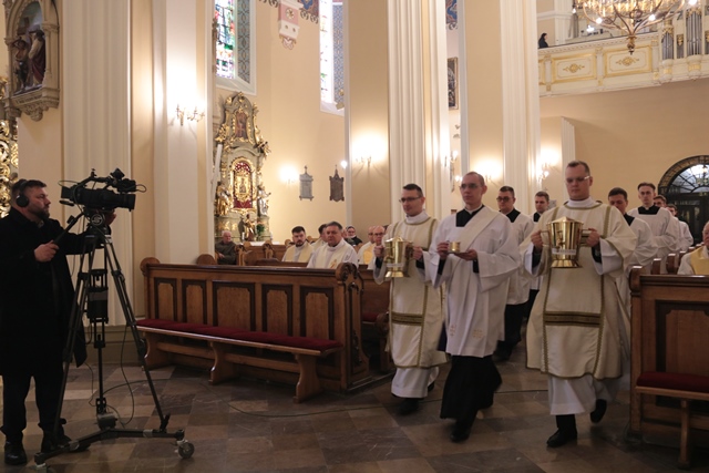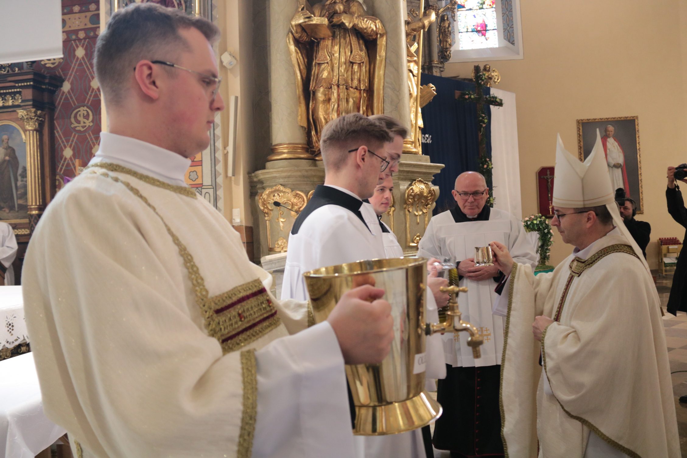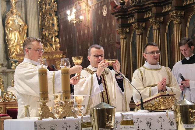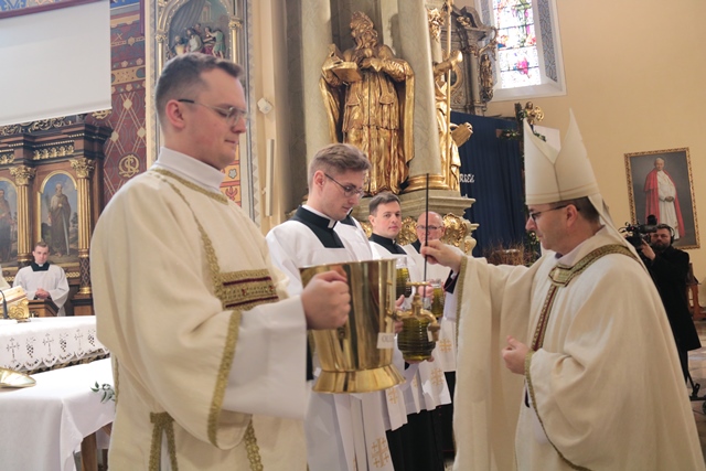 W czasie uroczystej liturgii biskup kaliski pobłogosławił krzyżmo oraz oleje chorych.
