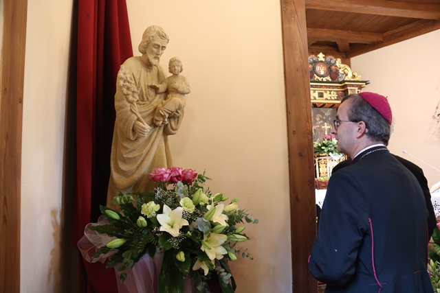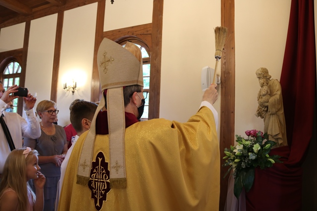 Fot. Ewa Kotowska-Rasiak/KAITen kościół jest znakiem obecności i błogosławieństwa Bożego, ale też jest miejscem, gdzie ma dokonać się spotkanie z Jezusem – mówił bp Damian Bryl w kościele filialnym w Olszynie. Biskup kaliski poświęcił odbudowaną świątynię drewnianą, nowy ołtarz oraz figurę św. Józefa, któremu parafianie powierzyli dzieło odbudowy.