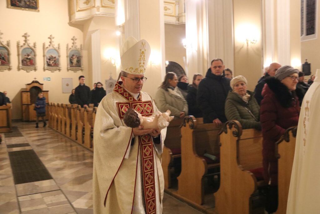 Przed rozpoczęciem Eucharystii w procesji biskup kaliski Damian Bryl zaniósł figurkę Dzieciątka do żłóbka.