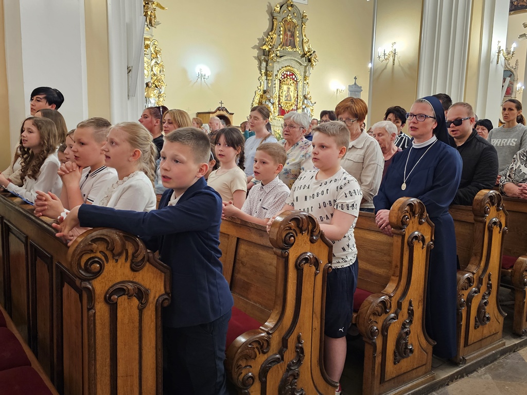 Po komunii św. z okazji ustanowienia Sakramentu Kapłaństwa dzieci z parafii katedralnej złożyły życzenia biskupowi kaliskiemu Damianowi Brylowi i obecnym kapłanom.