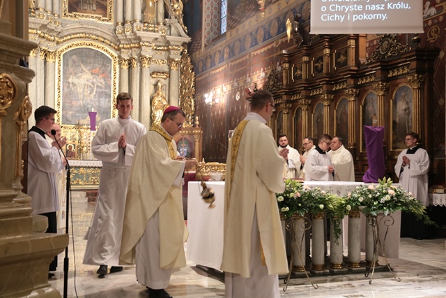 Fot. Ewa Kotowska-Rasiak/KAIBiskup kaliski Damian Bryl przewodniczył Mszy Wieczerzy Pańskiej w katedrze św. Mikołaja w Kaliszu. – Człowiek Eucharystii karmiony Ciałem i Krwią Pana idzie do drugiego człowieka w postawie służby, na kolanach – mówił w homilii ks. kan. Marcin Papuziński.