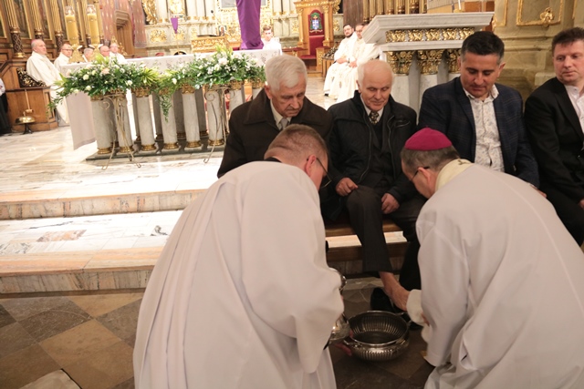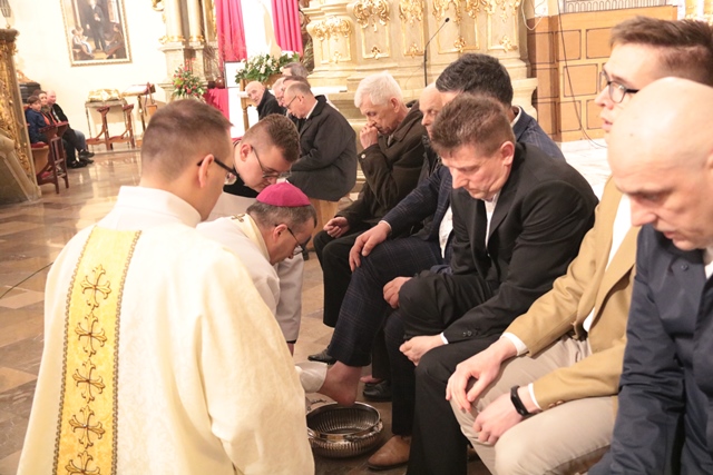 Podczas liturgii Wielkiego Czwartku bp Damian Bryl obmył nogi dwunastu mężczyznom – przedstawicielom parafian katedry św. Mikołaja w Kaliszu.