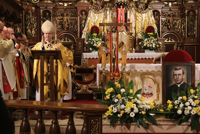 Wskazując na postawę bł. bpa Michała Kozala, przypomniał fragmenty homilii Jana Pawła II wygłoszonej podczas uroczystości beatyfikacyjnej w Warszawie. „Dzisiaj z radością i uniesieniem dopisujemy do nich jeszcze jedno imię i nazwisko: biskup Michał Kozal, powołany w przededniu ostatniej wojny i straszliwej okupacji do posługi biskupiej w Kościele włocławskim. Potem więziony i zesłany do obozu koncentracyjnego w Dachau. Jeden z tysięcy! Tam umęczony – odszedł w opinii świętości. Dziś tu, w Warszawie, wyniesiony do chwały ołtarzy jako męczennik” – cytował biskup kaliski.
