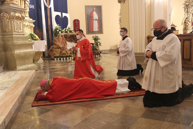 Podczas liturgii Wielkiego Piątku z bp Łukaszem Buzunem modlili się: biskup kaliski Damian Bryl, bp senior Stanisław Napierała, proboszcz katedry ks. prał. Adam Modliński i wikariusze tej parafii.