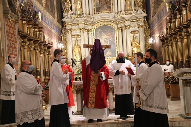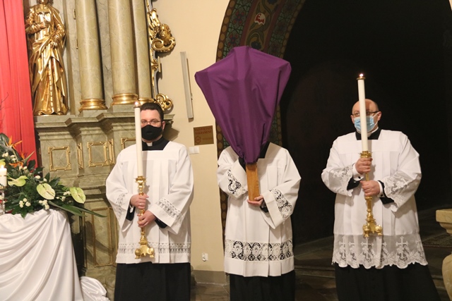 Po odczytaniu Męki Pańskiej i Modlitwie Powszechnej nastąpiło odsłonięcie krzyża i adoracja przez duchowieństwo i służbę liturgiczną poprzez przyklęknięcie.