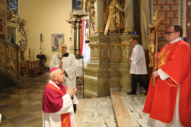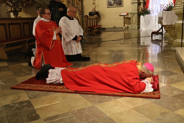 Podczas liturgii Wielkiego Piątku z bp Łukaszem Buzunem modlili się: biskup kaliski Edward Janiak, bp senior Stanisław Napierała, proboszcz katedry ks. prał. Adam Modliński i wikariusze tej parafii.